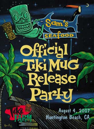 "Sam's Seafood Mug Release Party - 2007" Original: enamel on stretched canvas: 18 in. x 24 in. Original event art for the Tiki Farm mug release party held at Sam's Seafood in Huntington Beach, CA. New green mug designed by Sam Gambino. Contact me to BUY THIS PAINTING.... © 2007 Sam Gambino. All Rights Reserved. |